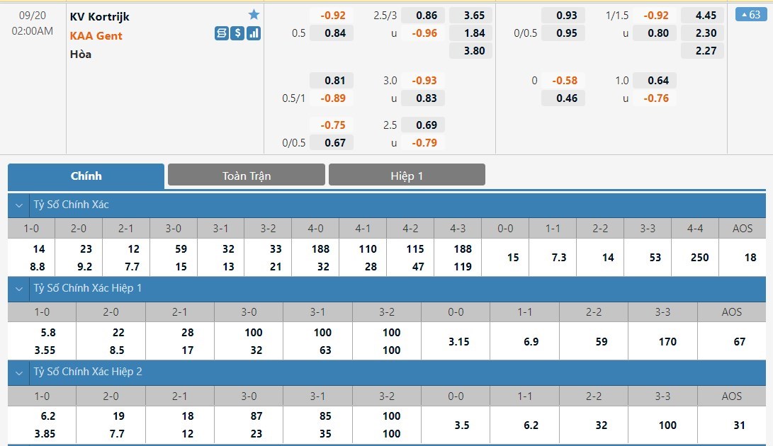 Tip kèo tỷ số hiệp 1: Kortrijk 0-1 KAA Gent