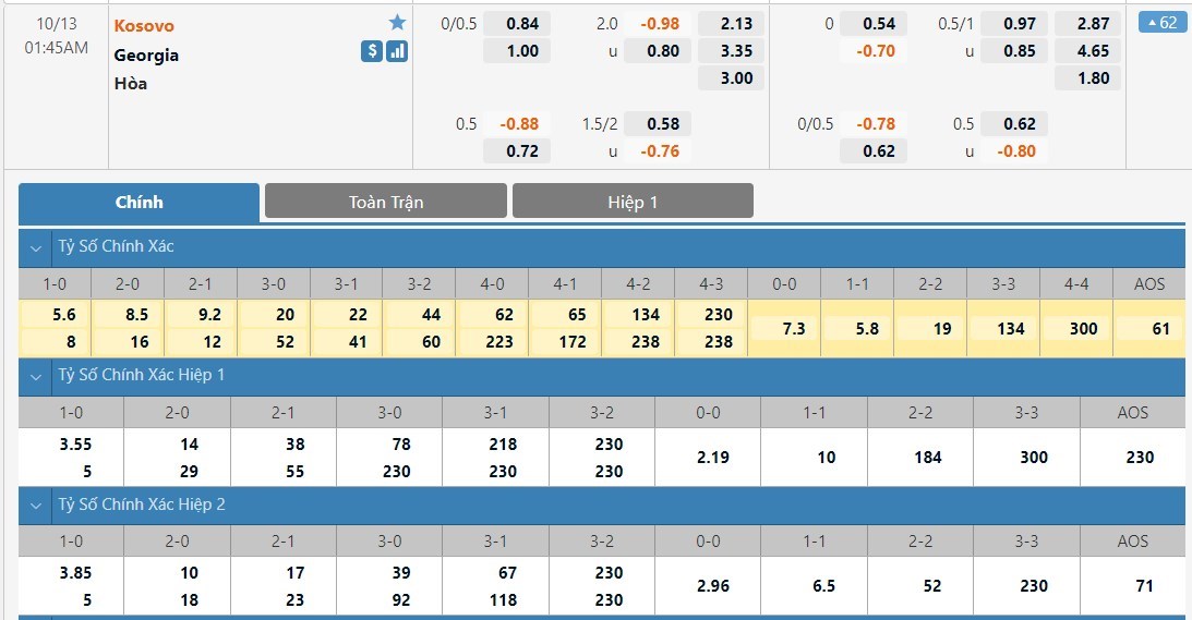 Tip kèo tỷ số hiệp 1: Kosovo 0-0 Georgia