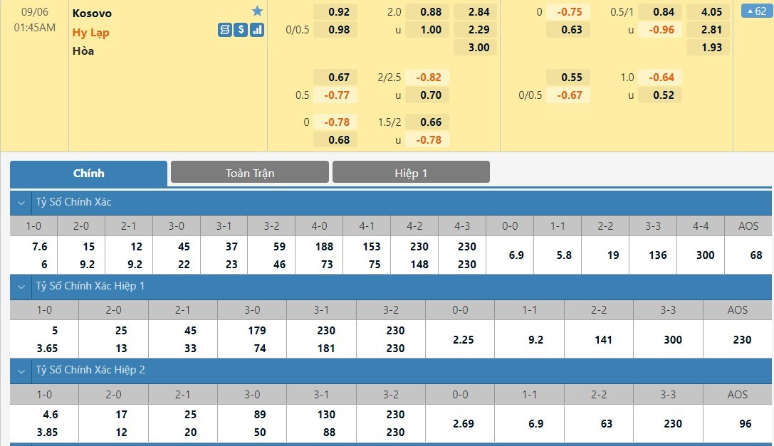 Tip kèo tỷ số hiệp 1: Kosovo 0-0 Hy Lạp