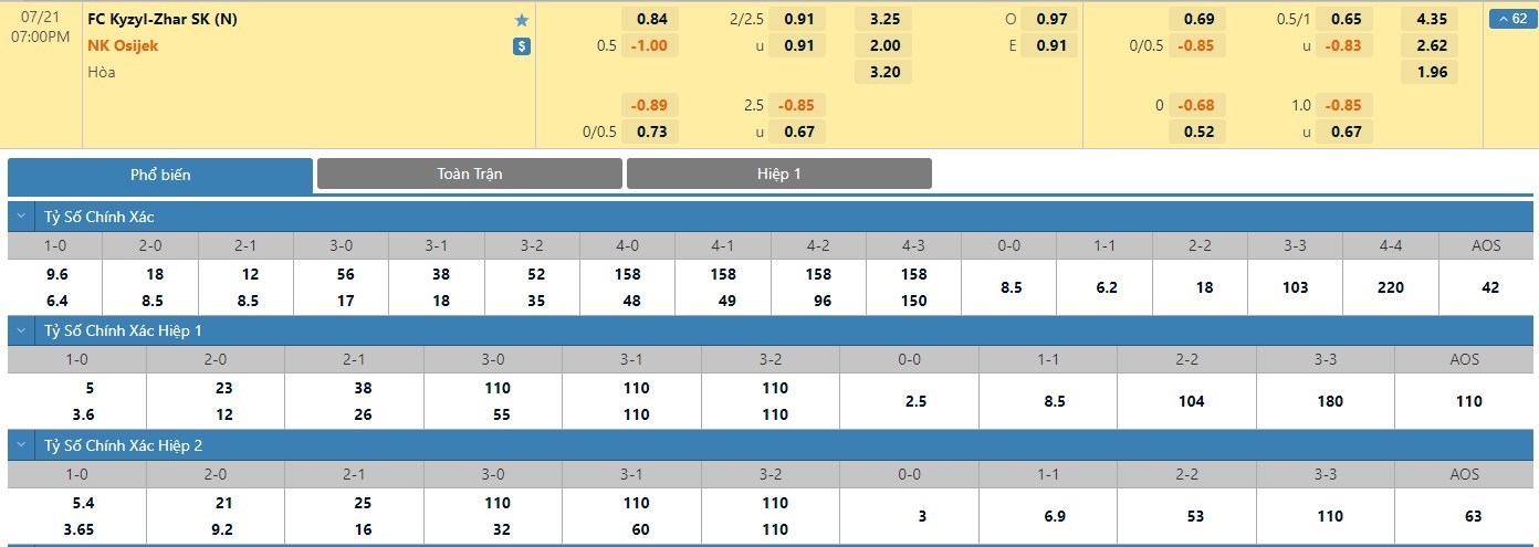 Tip kèo tỷ số hiệp 1: Kyzylzhar 0-1 Osijek