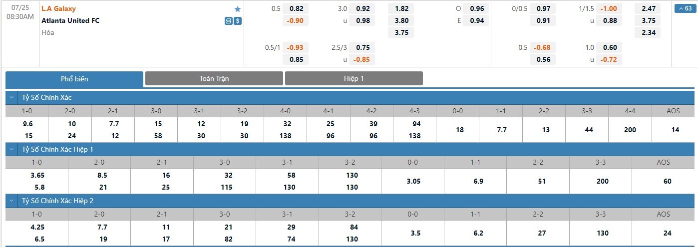 Tỷ lệ kèo được đưa ra ở cuộc đối đầu này là -1/2 trái và LA Galaxy đang được đánh giá ở thế cửa trên. Tuy nhiên, người chơi cũng nên tin tưởng vào đội khách để có cơ hội thắng kèo cao hơn trong cuộc đối đầu này khi mà phong độ của đội chủ nhà trong giai đoạn gần đây là vô cùng bạc nhược. Nếu như LA Galaxy đã có được cho mình 1/5 trận đấu gần nhất mang về 1 bàn thắng trong hiệp đấu đầu tiên thì Atlanta United cũng chỉ có 1 lần làm được điều này. Với tỷ lệ kèo hiệp 1 là -1/4 thì người chơi nên tin tưởng vào đội khách để mang về cơ hội thắng cao hơn.
