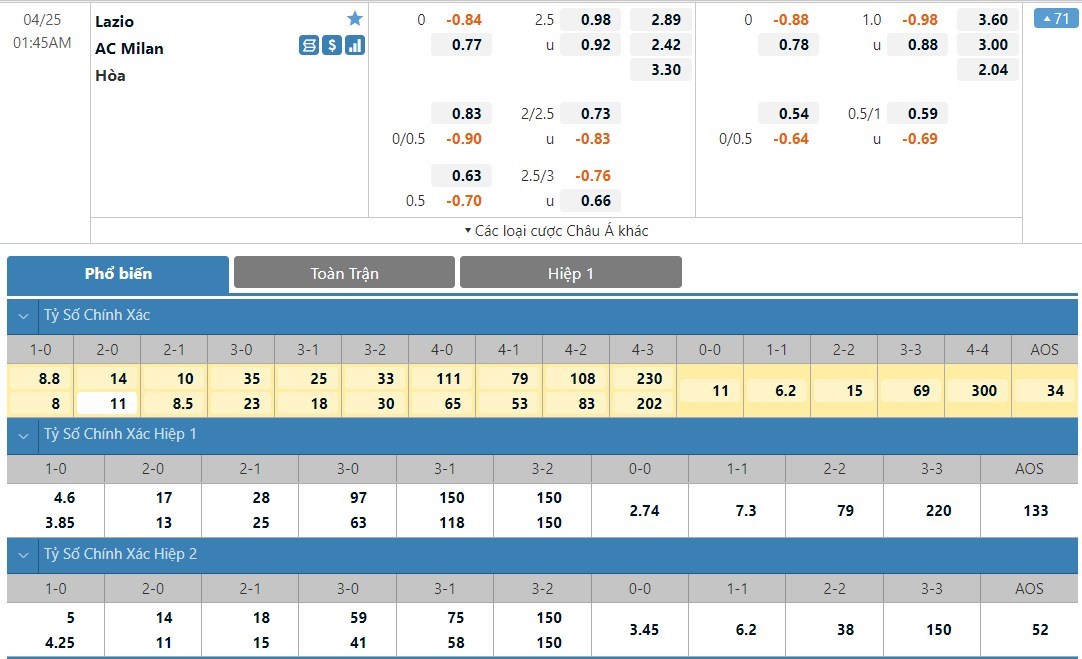Tip kèo tỷ số hiệp 1: Lazio 1-1 AC Milan