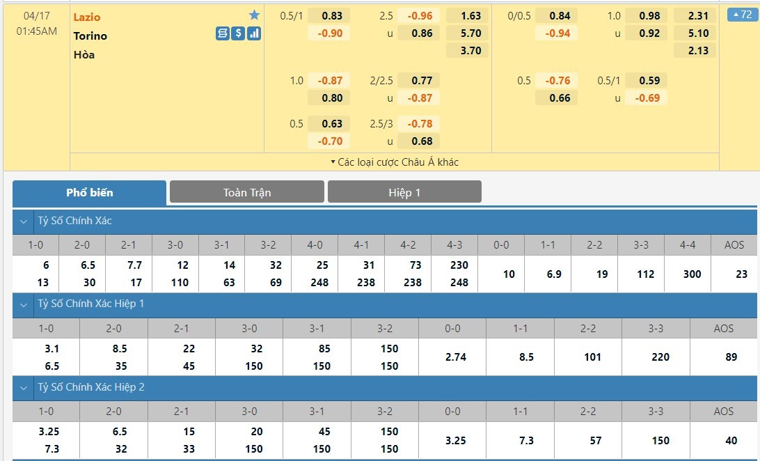 Tip kèo tỷ số hiệp 1: Lazio 1-0 Torino