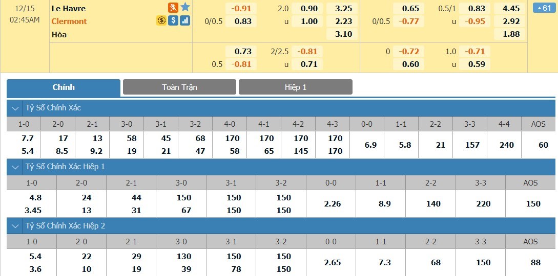 Tip kèo tỷ số hiệp 1: Le Havre 0-0 Clermont Foot