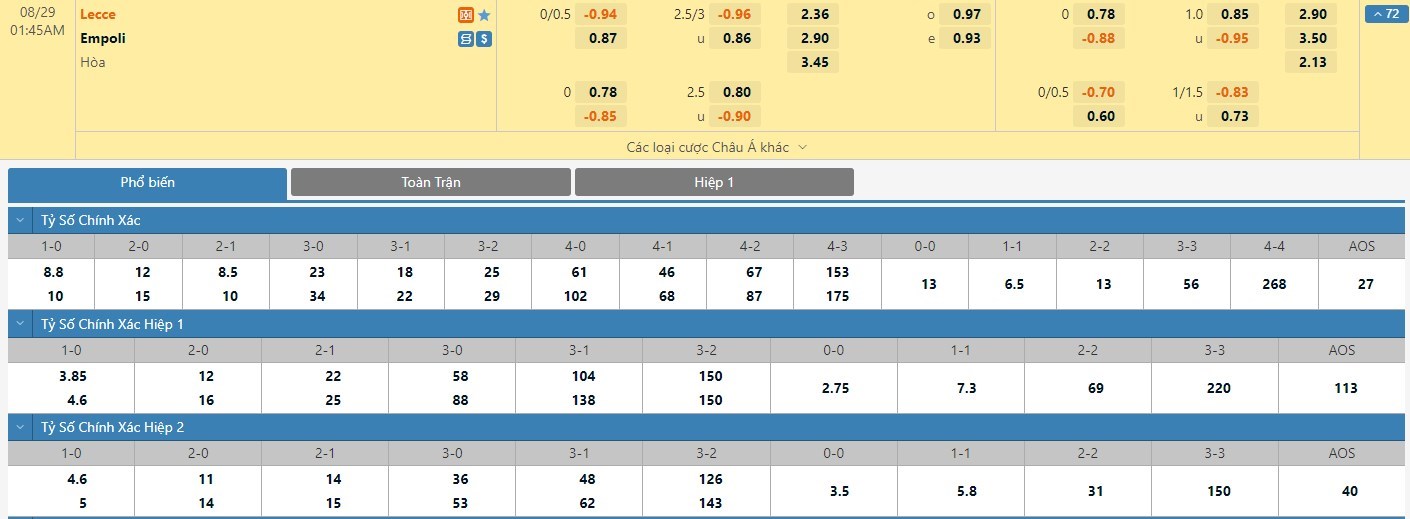 Trong 5 trận đấu gần nhất của hai đội bóng này trên mọi đấu trường, trong khi Lecce mang về cho mình 1 trận đấu ghi được ít nhất 1 bàn ở hiệp 1 thì Empoli đã thể hiện tốt hơn khi có được cho mình 2 lần. Người chơi nên tin tưởng vào kịch bản hai đội sẽ cầm chân nhau trong 45 phút để có sự an toàn lớn hơn.