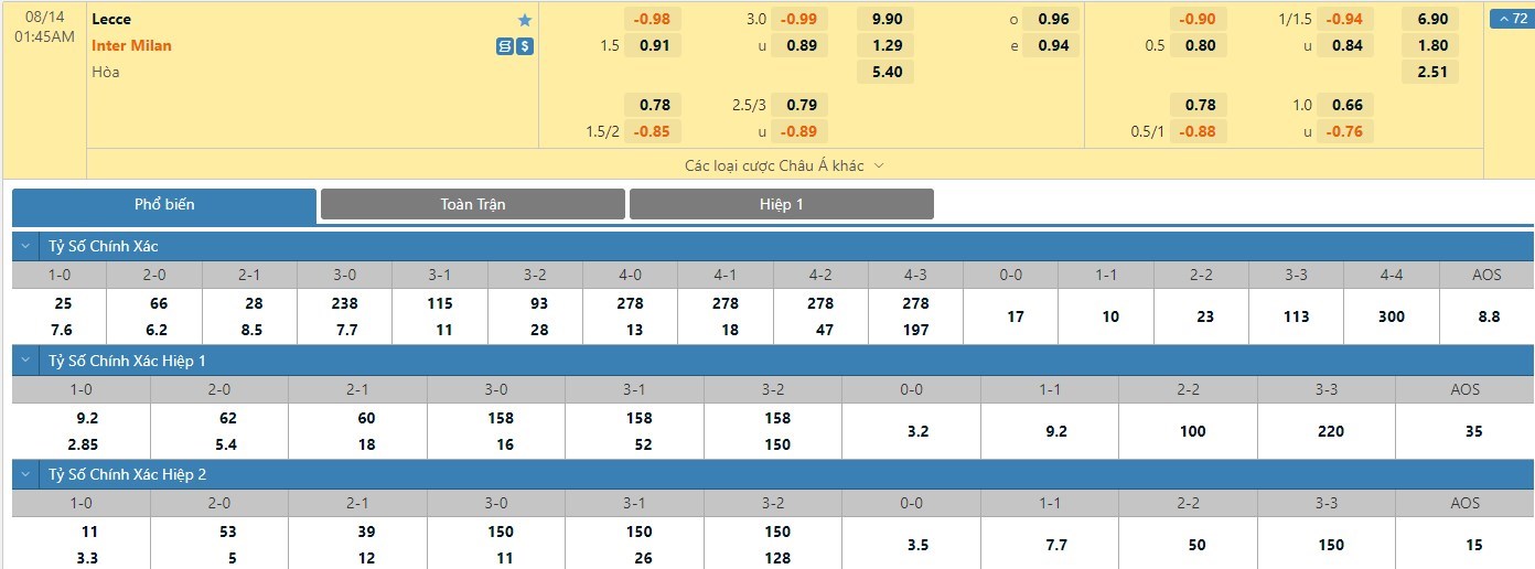 Nếu như Lecce đã có được cho mình 1/5 trận đấu gần nhất mang về 1 bàn thắng trong hiệp đấu đầu tiên thì Inter Milan đã có 3 lần làm được điều này. Với tỷ lệ kèo hiệp 1 là Inter ở thế kèo trên chấp tỷ lệ -1/2 trái thì người chơi nên tin tưởng vào đội khách để mang về cơ hội thắng cao hơn.
