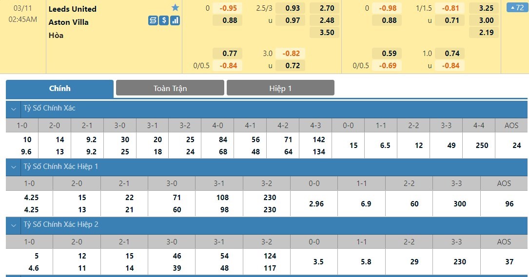 Tip kèo tỷ số hiệp 1: Leeds 0-1 Aston Villa