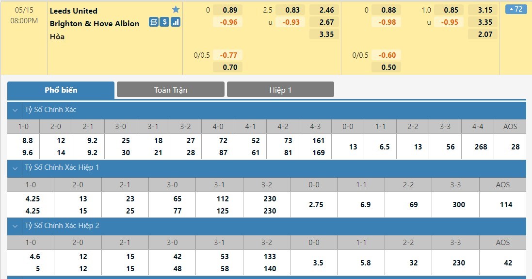 Tip kèo tỷ số hiệp 1: Leeds 0-0 Brighton