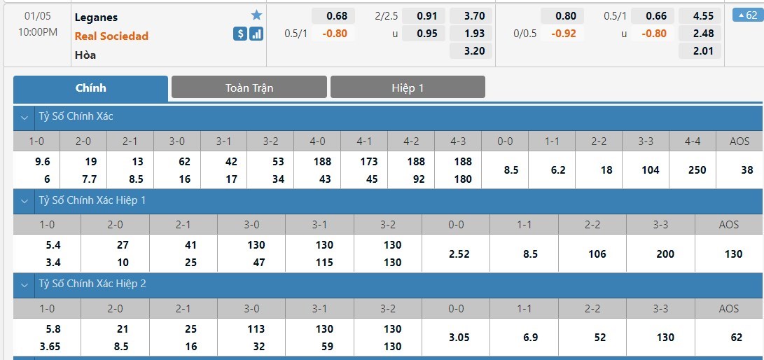 Tip kèo tỷ số hiệp 1: Leganes 1-1 Real Sociedad