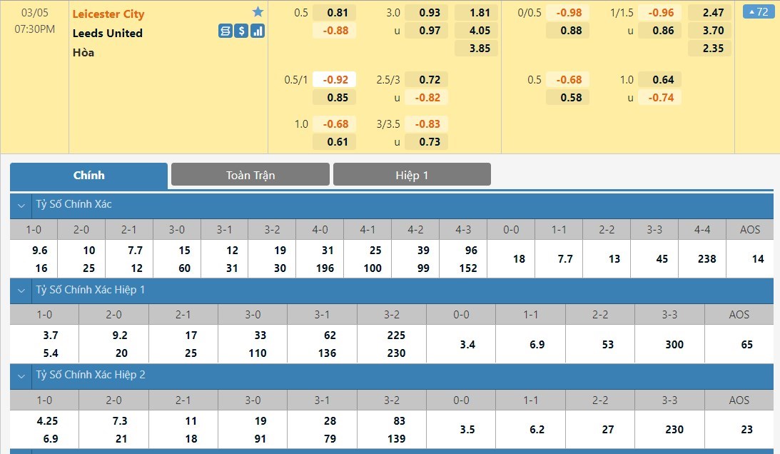 Tip kèo tỷ số hiệp 1: Leicester City 1-0 Leeds United