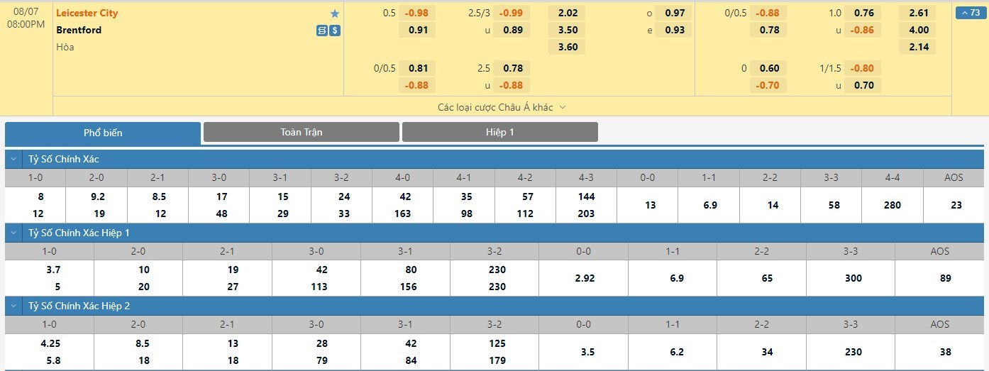 Tip kèo tỷ số hiệp 1: Leicester 1-0 Brentford