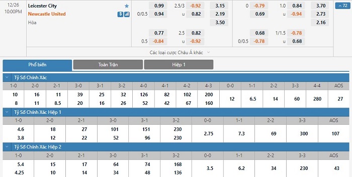Với việc luôn không thi đấu tốt trước Leicester và yếu tố sân nhà, nhà cái ra độ hòa được thua cho hiệp 1 và Newcastle chấp 0,25 cho cả trận. Đây là trận đấu mà Newcastle có thể thắng nhiều hơn 1 bàn nên khách chơi nên cân nhắc chọn cửa trên.