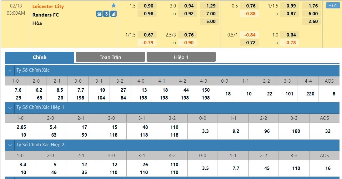 Tip kèo tỷ số hiệp 1: Leicester 2-0 Randers FC