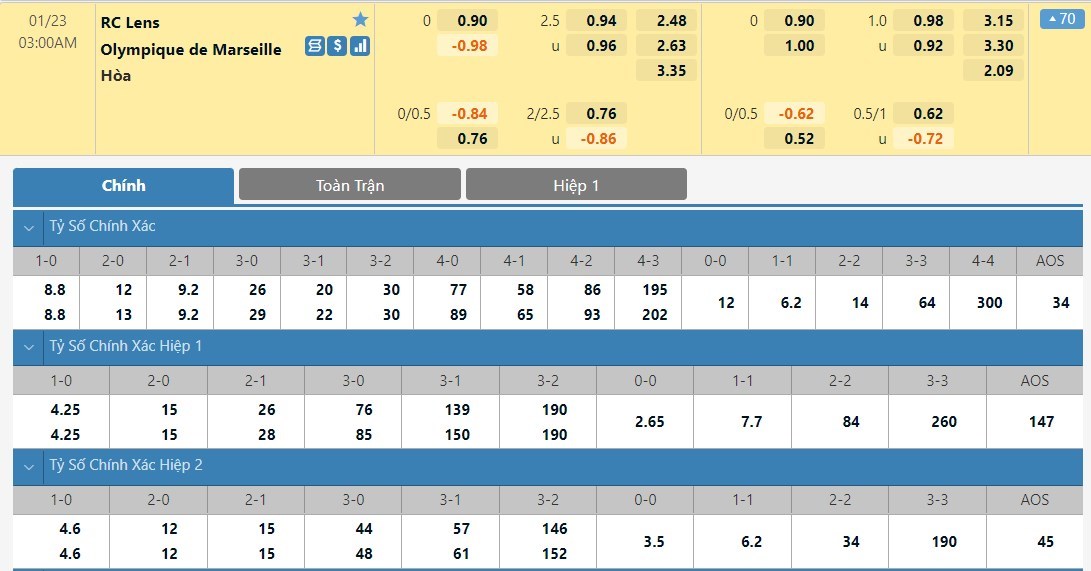 Tip kèo tỷ số hiệp 1: Lens 1-1 Marseille
