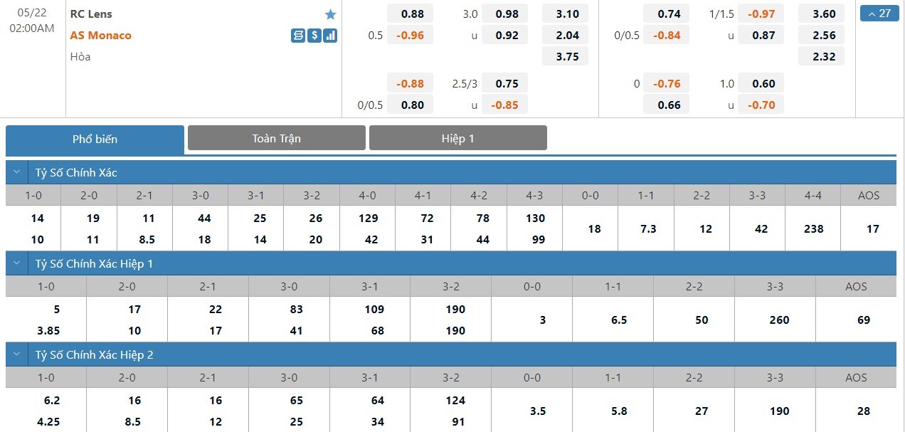 Tip kèo tỷ số hiệp 1: Lens 1-1 Monaco