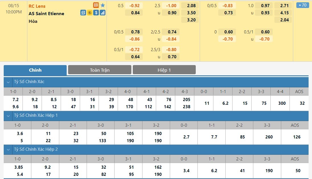 Tip kèo tỷ số hiệp 1: Lens 0-0 Saint-Etienne