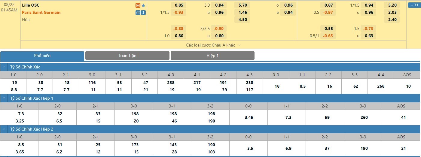 Tip kèo tỷ số hiệp 1: Lille 0-1 Paris Saint-Germain