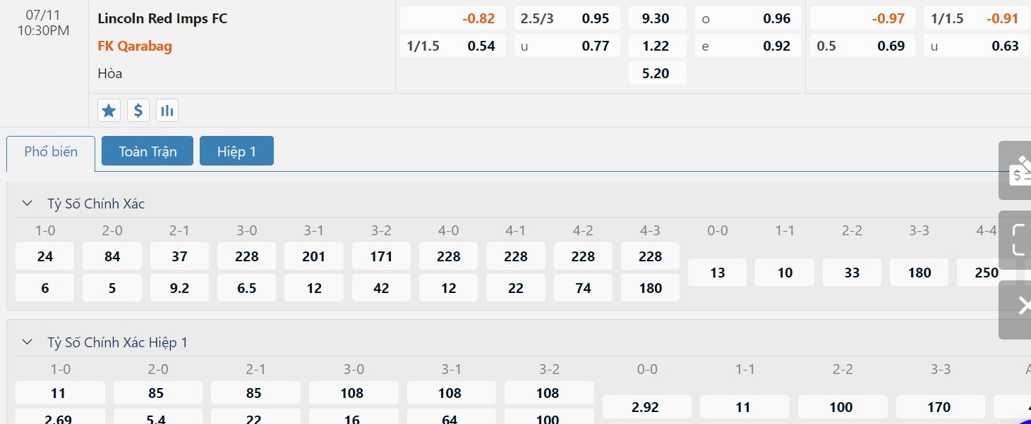 Dù chơi trên sân nhà trong trận đấu lượt đi nhưng nhà cái vẫn đánh giá rất thấp cơ hội tạo ra bất ngờ của Lincoln Red Imps. Nhà cái đặt Qarabag FK ở thế cửa trên cùng mốc chấp -1 1/4 trái. Mốc chấp sâu đã cho thấy sự vượt trội rõ rệt của Qarabag FK trong cặp trận này.