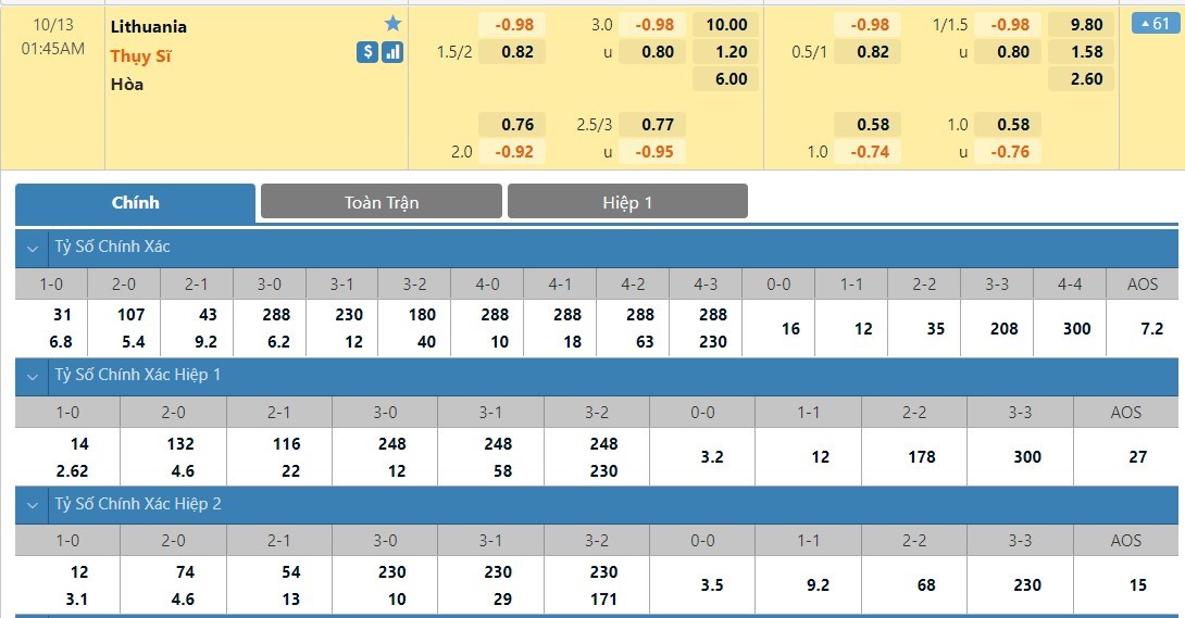 Tip kèo tỷ số hiệp 1: Lithuania 0-1 Thụy Sĩ