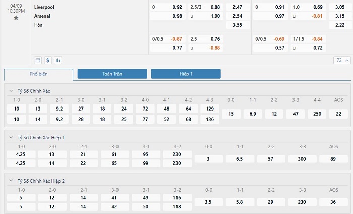 Tip kèo tỷ số hiệp 1: Liverpool 1-1 Arsenal