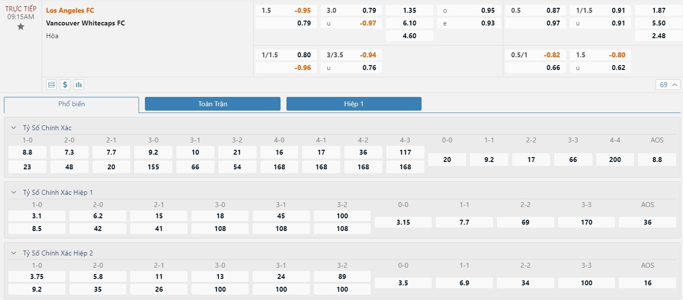 Tip kèo tỷ số hiệp 1: Los Angeles FC 1-1 Vancouver Whitecaps