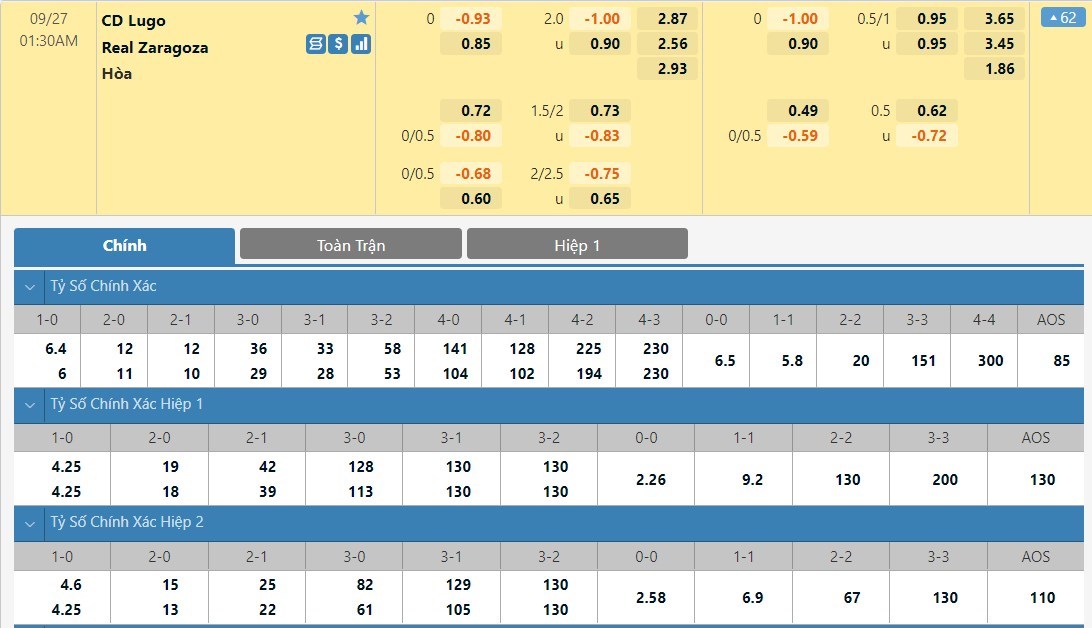 Tip kèo tỷ số hiệp 1: Lugo 0-0 Real Zaragoza