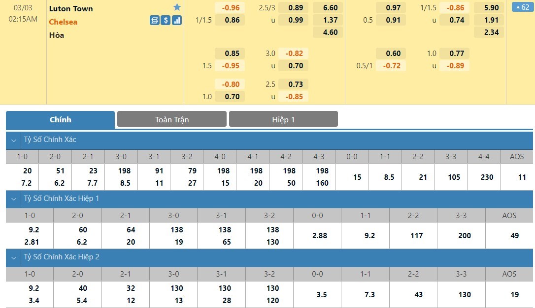 Tip kèo tỷ số hiệp 1: Luton Town 0-1 Chelsea