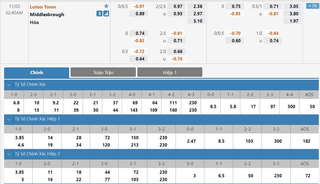 Tip kèo tỷ số hiệp 1: Luton Town 0-0 Middlesbrough