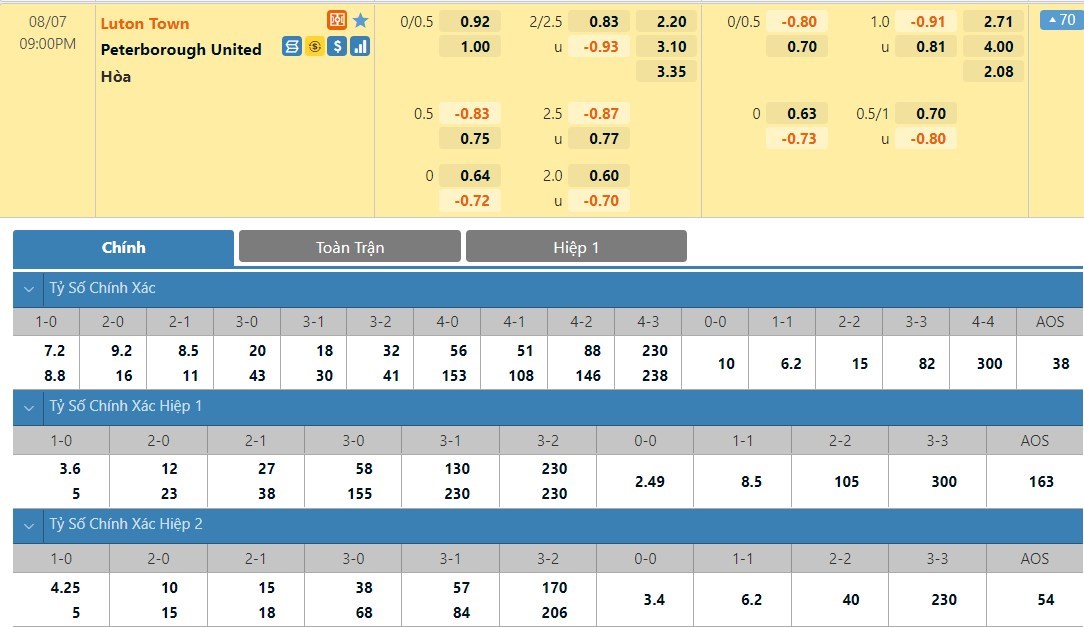 Tip kèo tỷ số hiệp 1: Luton 1-1 Peterborough
