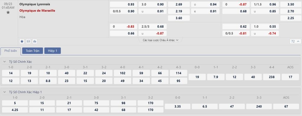 Tip kèo tỷ số hiệp 1: Lyon 0-1 Marseille