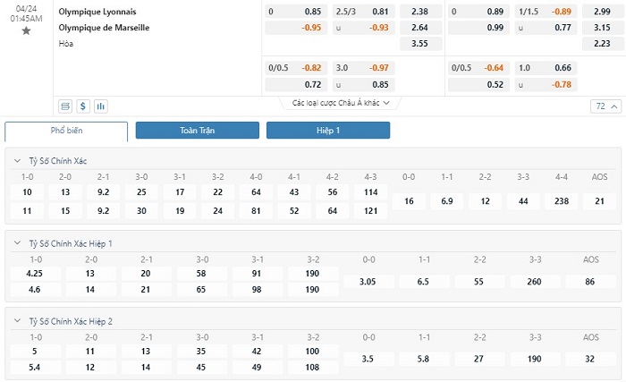 Tip kèo tỷ số full time: Lyon 1-1 Marseille