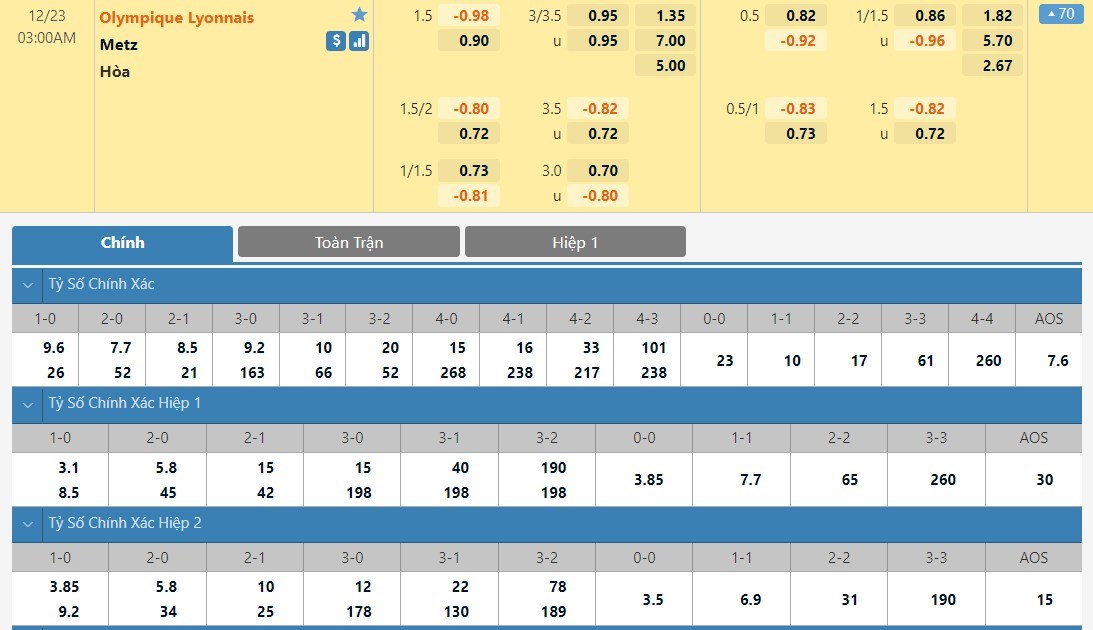 Tip kèo tỷ số hiệp 1: Lyon 1-0 Metz