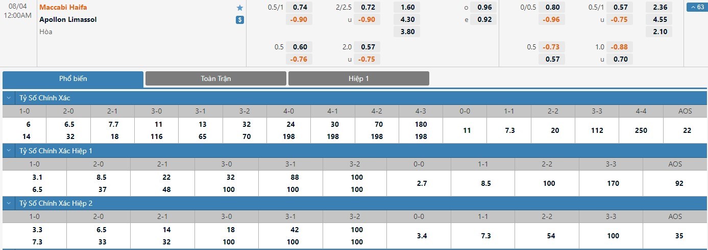 Tip kèo tỷ số hiệp 1: Maccabi Haifa 1-0 Apollon Limassol
