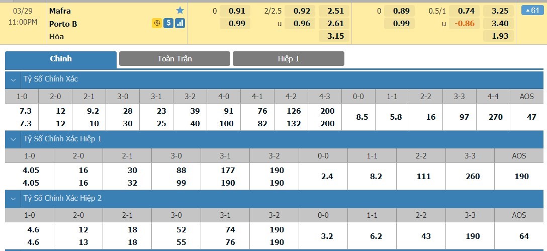 Tip kèo tỷ số hiệp 1: Mafra 1-0 FC Porto B