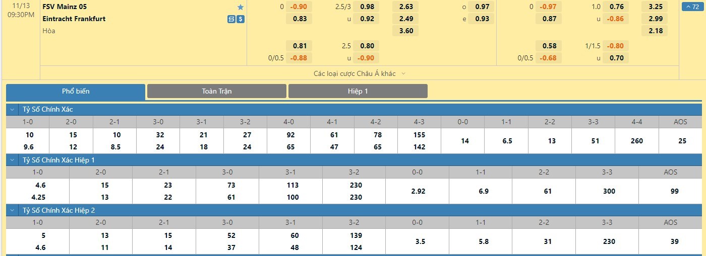 Trong 5 trận đấu gần nhất đôi bên đụng độ nhau trực tiếp, Mainz 05 đã có 2 trận đấu mang về được cho mình ít nhất là 1 bàn thắng trong hiệp đấu đầu tiên. Còn với Eintracht Frankfurt, đội bóng này đã có 3 lần làm được điều này trong 45 phút đầu tiên. Với kèo hiệp 1 ở trận đấu này thì người chơi nên tin tưởng vào đội khách trận này.