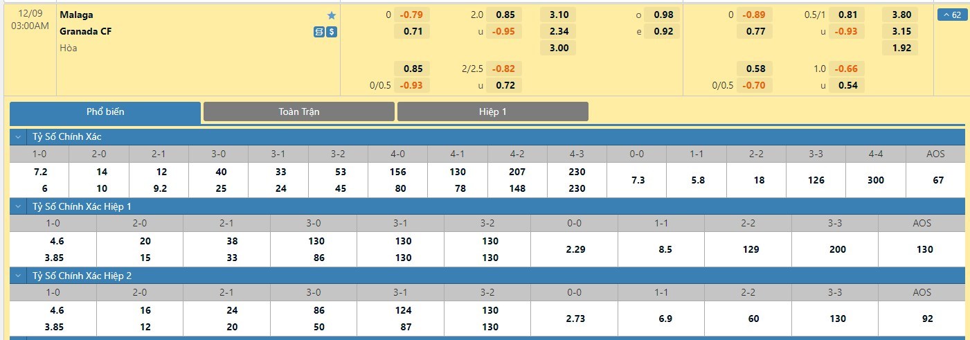 Trong 5 trận đấu gần nhất đôi bên đụng độ nhau trực tiếp, Malaga chỉ có 1 trận đấu mang về được cho mình ít nhất là 1 bàn thắng trong hiệp đấu đầu tiên. Còn với Granada, đội bóng này đã có 4 lần làm được điều này trong 45 phút đầu tiên. Với kèo hiệp 1 thì người chơi nên tin tưởng vào đội khách trận này.
