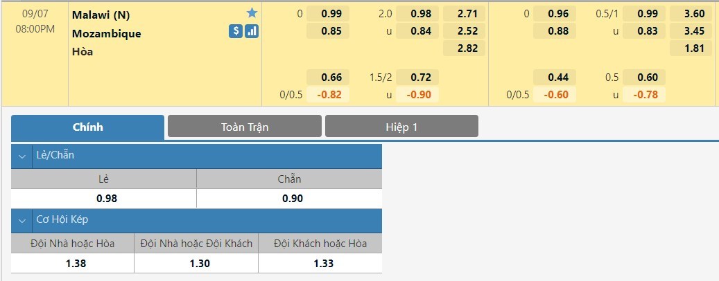 Tip kèo tỷ số hiệp 1: Malawi 0-0 Mozambique