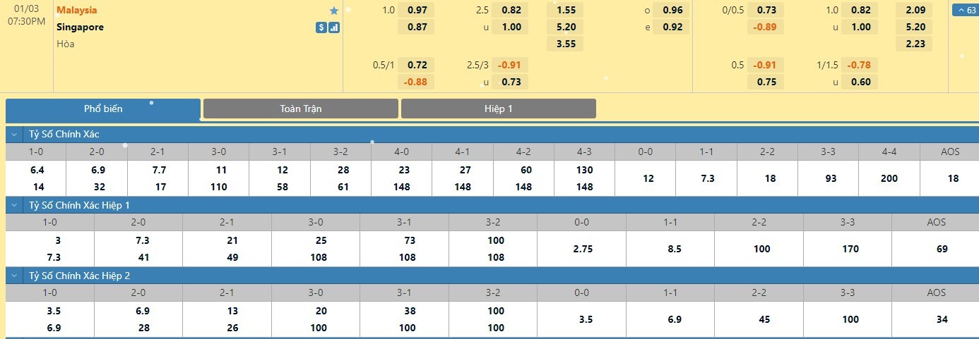 Tip kèo tỷ số hiệp 1: Malaysia 0-0 Singapore