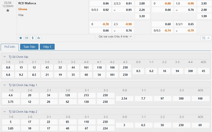 Chạm trán với Mallorca ở trận đấu tới đây sẽ mang tới vô cùng nhiều khó khăn đối với các cầu thủ Girona, nhất là trong bối cảnh mà họ còn phải hành quân xa nhà. 2 trận đấu gần nhất chơi trên sân khách thì Girona đều phải nhận thất bại. Sự cẩn trọng nơi mặt trận phòng ngự là những gì mà Girona sẽ phải ưu tiên ở trên sân. Với kèo đấu nhà cái đưa ra là đội khách chấp tỷ lệ 1/4 trái thì giới mộ điệu nên lựa chọn ô cược Mallorca.