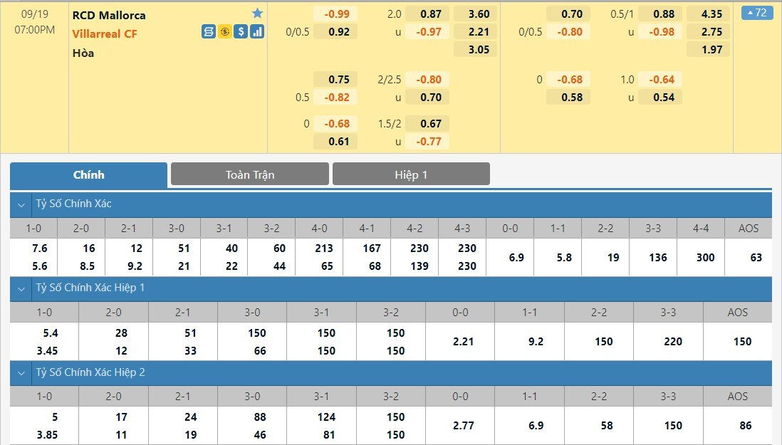 Tip kèo tỷ số hiệp 1: Mallorca 0-0 Villarreal