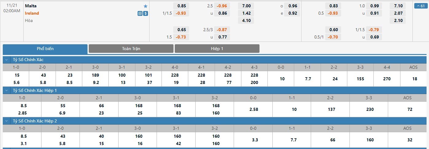 Trong 5 trận đấu gần nhất của mình, Malta không có trận đấu nào mang về được cho mình ít nhất là 1 bàn thắng trong hiệp đấu đầu tiên. Còn với Ireland, đội bóng này cũng đã có 4 lần làm được điều này trong 45 phút đầu tiên. Người chơi đương nhiên nên tin tưởng vào Ireland trong hiệp 1 để có sự an toàn lớn hơn.
