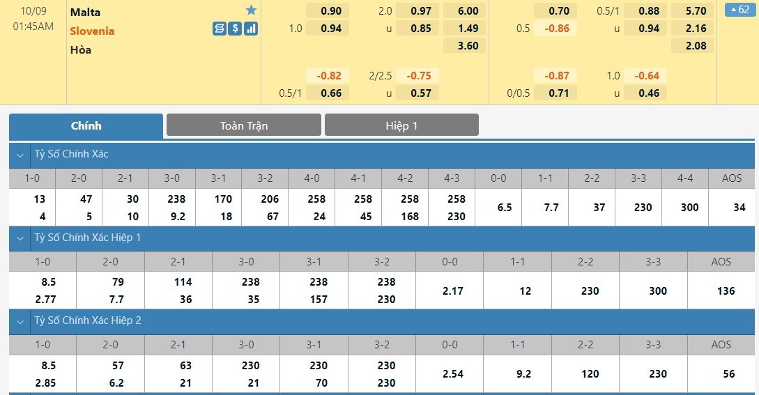 Tip kèo tỷ số hiệp 1: Malta 0-0 Slovenia
