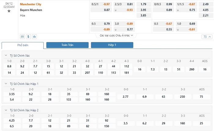 Tip kèo tỷ số hiệp 1: Manchester City 0-0 Bayern Munich