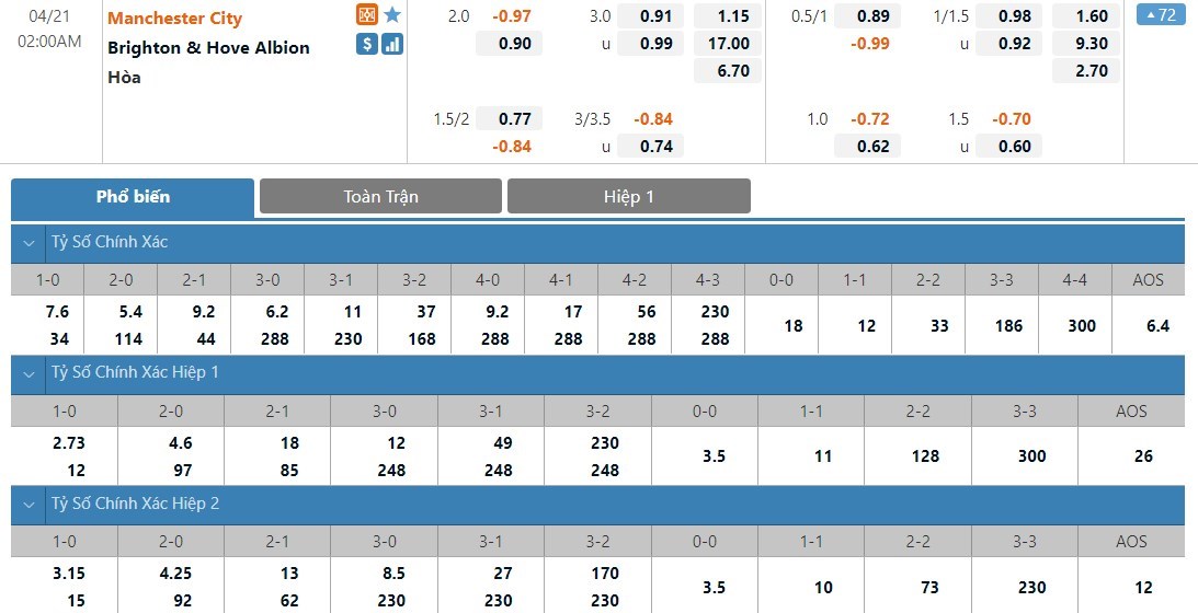 Tip kèo tỷ số hiệp 1: Manchester City 1-0 Brighton