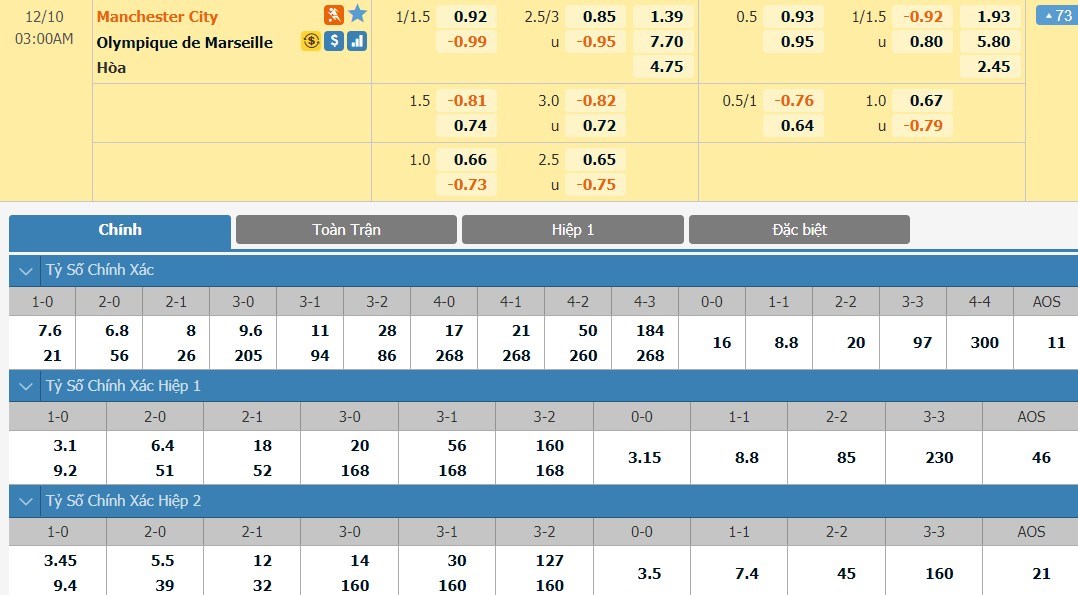 Tip kèo tỷ số hiệp 1: Manchester City 1-0 Marseille