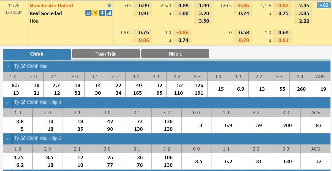 Tip kèo tỷ số hiệp 1: Manchester United 1-0 Real Sociedad