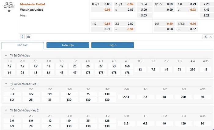 Trong 5 lần gần nhất đối đầu nhau trực tiếp, Man United đã có 2 trận đấu chọc thủng lưới đối phương trong hiệp đấu đầu tiên. Trong khi đó, West Ham cũng đã sở hữu thành tích tương tự. Với tỷ lệ kèo hiệp 1 là Manchester United -1/4 trái thì người chơi nên lựa chọn vào đội chủ nhà trận này. Trong 5 trận đấu gần nhất trên mọi đấu trường, hàng công của Man United đã mang về cho mình 11 pha lập công cùng với 3 lần phải vào lưới nhặt bóng. Bên kia chiến tuyến, các chân sút West Ham đã sở hữu 8 bàn thắng, còn lại là việc hàng thủ đã phải nhận 4 bàn thua. Ở 5 lần gần nhất đối đầu nhau, chỉ có vỏn vẹn 1 trận đấu giữa hai đội kết thúc với tổng số bàn thắng từ 3 trở lên. Các nhà đầu tư nên tin tưởng vào khả năng nổ Tài ở cuộc đối đầu này với tỷ lệ tài xỉu là 2 3/4 trái.