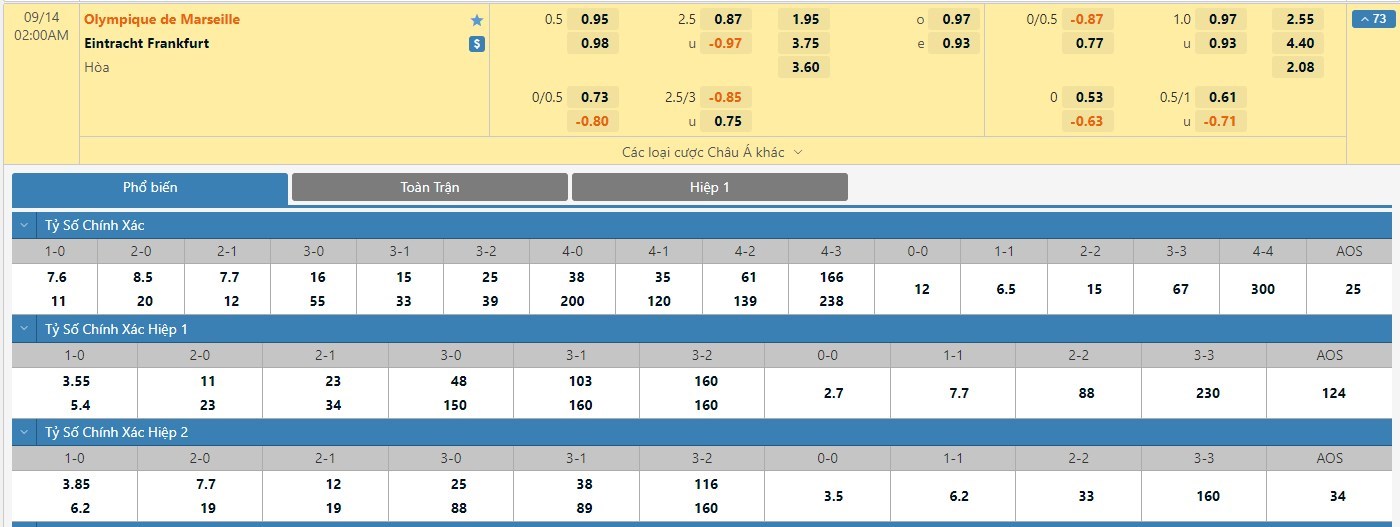 Trong 5 trận đấu gần nhất, Marseille đã có 2 trận đấu mang về được cho mình ít nhất là 1 bàn thắng trong hiệp đấu đầu tiên. Còn với Eintracht Frankfurt, đội bóng này đã có 2 lần làm được điều đó. Với tỷ lệ kèo hiệp 1 ở trận đấu này được đưa ra là đội chủ nhà chấp -1/4 trái thì người chơi nên tin tưởng vào ô cược đội khách trận này. Chuyên gia nhận định hai đội sẽ tạo nên thế trận đôi công ăn miếng trả miếng ngay từ đầu trận.