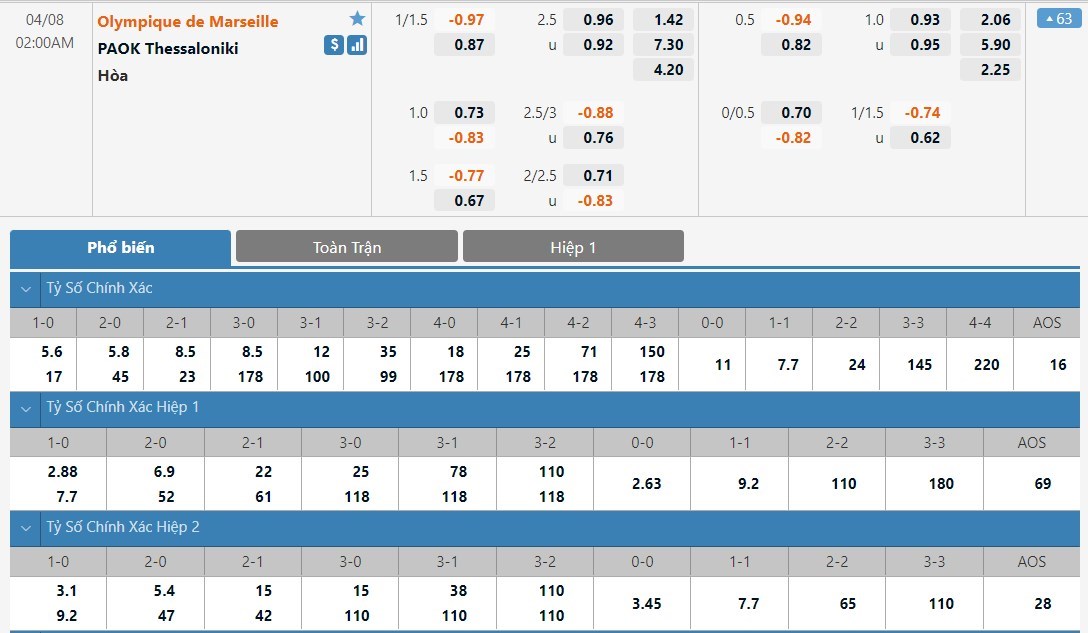 Tip kèo tỷ số hiệp 1: Marseille 1-0 PAOK Thessaloniki