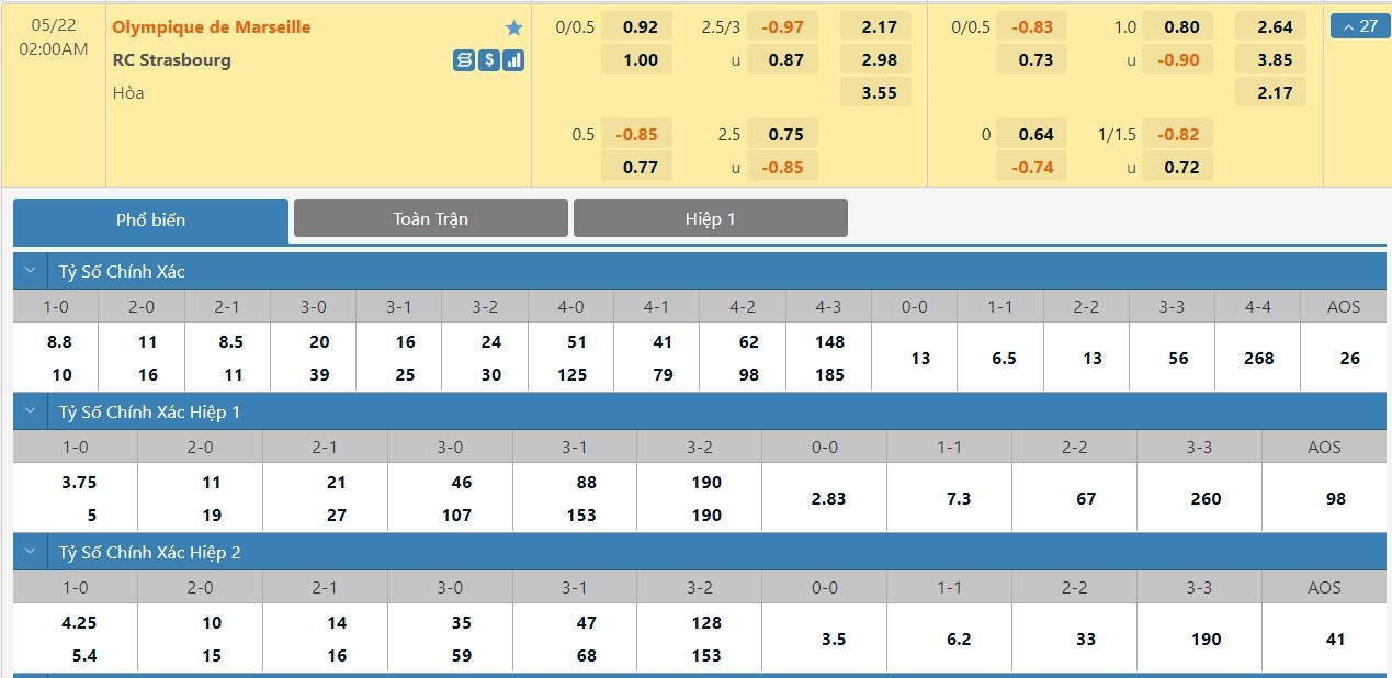 Tip kèo tỷ số hiệp 1: Marseille 0-0 Strasbourg